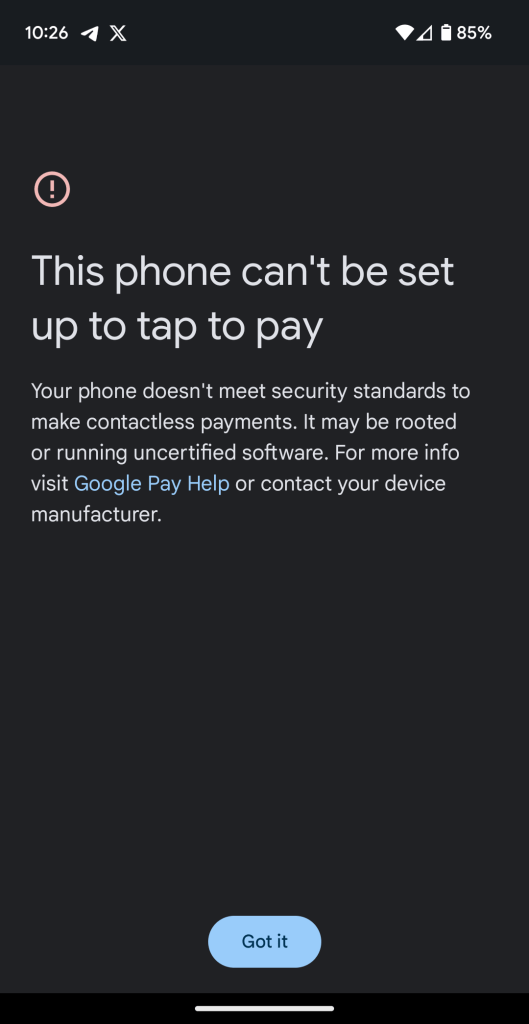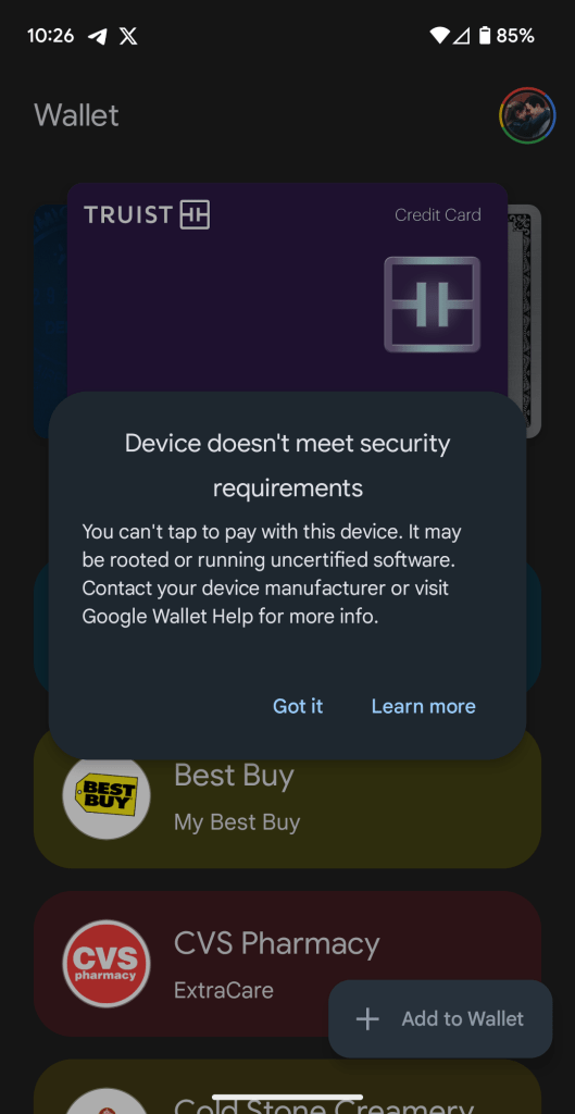 On my Pixel Fold, opening the Wallet app results in a pop-up saying that the “device doesn’t meet security requirements” and that “you can’t tap to pay with this device.” Attempting to add a new card results in a similar error.