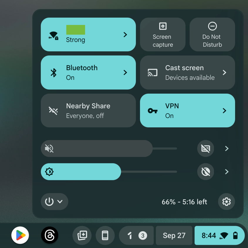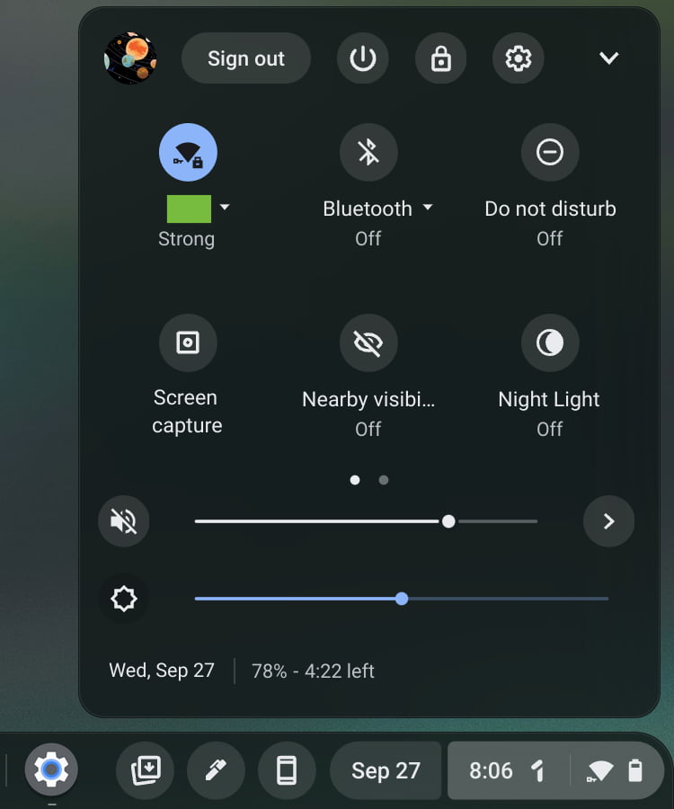 You’ll then find a volume slider with a Live Caption button with a tap letting you make more adjustments. Then there’s brightness and Night Light with the full panel letting you turn on/off the Dark theme.