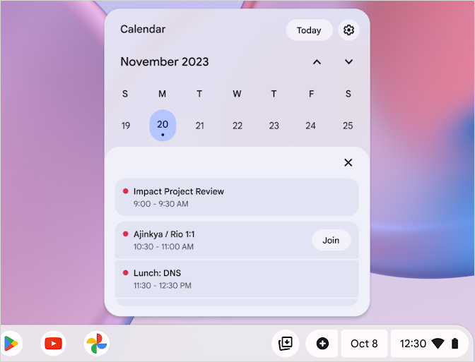 Moving left of the shelf is the date, with ChromeOS 117 updating that Calendar View with a “Join” video call button for upcoming meetings. There’s also now support for multi-day events.