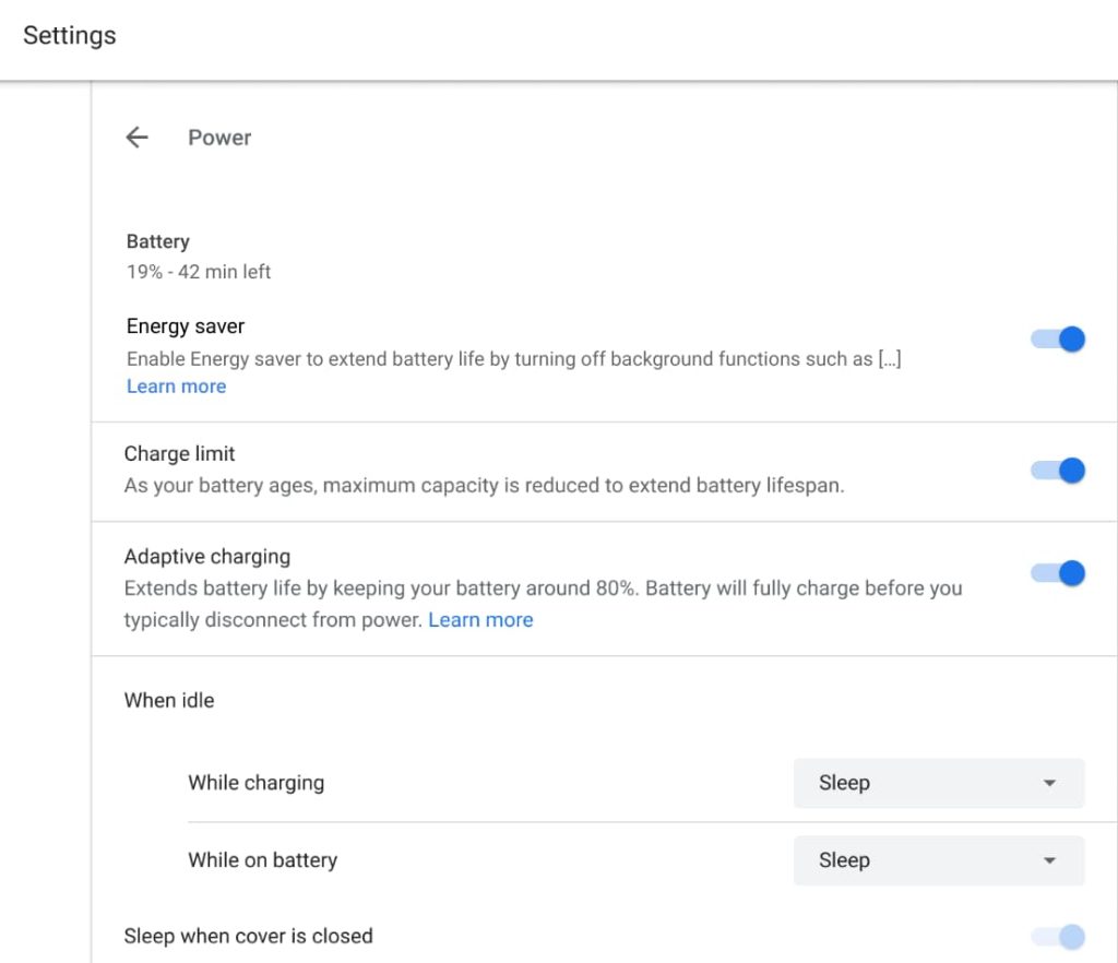 In settings, you’ll also find Adaptive Charging. This is not available on all devices as of today. If supported, going to Settings > Device > Power will let you control the capability: