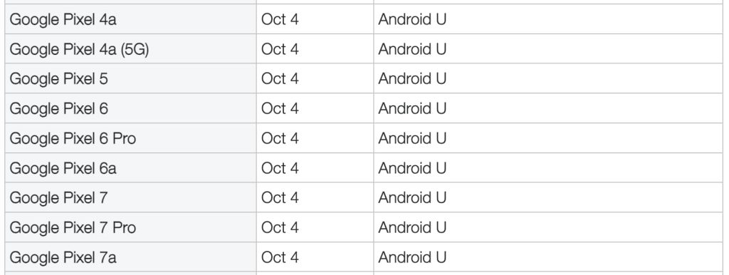 According to Telus, “Android U” has an “Approx date” of Wednesday, October 4. The Canadian carrier says this update is coming to the Google Pixel 7a, Pixel 7 Pro, Pixel 7, Pixel 6a, Pixel 6 Pro, Pixel 6, Pixel 5, Pixel 4a (5G), and Pixel 4a.