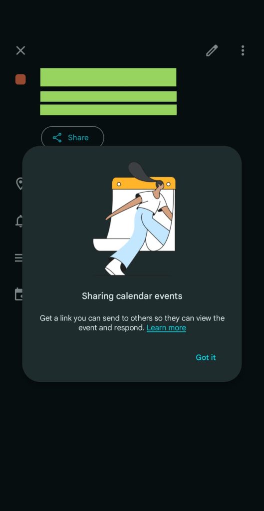 Once live for your account, opening a Calendar event will reveal a “Share” button near the top of the screen. This will generate a calendar.app.google/xxxxxxxxxxxxxx link for you to copy and send. The default message is as follows: