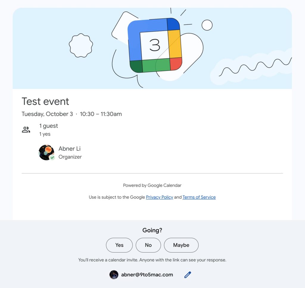 Those that visit the URL, which opens in browsers, can find event details and respond. The latter is a one-click process if they are signed in to their Google Account, but otherwise guests have to enter their email.