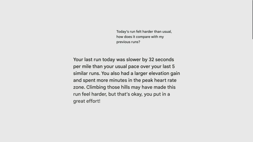 In response, the chatbot looked at his full Fitbit profile to offer a more complete answer of why the run seemed harder. First, the AI acknowledged that the workout was indeed more strenuous with a higher average heart rate. Next, it pointed to his recent downward trend in sleep quality along with the run’s path having more inclines than his usual route.