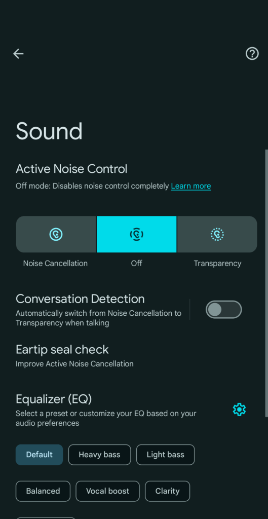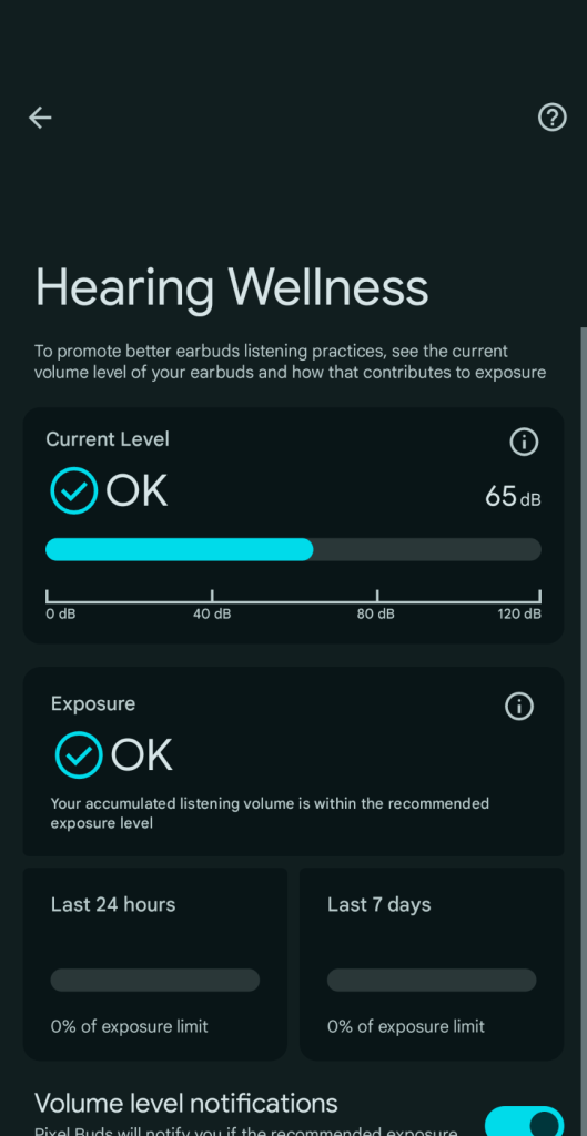 The main menu is also home to “Hearing Wellness.” The Current Level notes the decibel level of what you’re listening to in real time. Exposure “measures your listening volume over time” and counts toward a maximum recommended amount over the last 24 hours and seven days. You can also receive volume level notifications if that limit is exceeded. It does not appear to be integrated with Android’s broader Digital Wellbeing functionality.