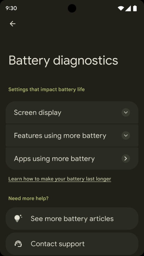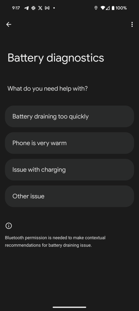 In the meantime, on Pixel 8, there’s no dedicated app icon for the Troubleshooting app. Rather, it only appears within the Settings menu, including under a new “Battery Diagnostics” button in the battery page, and “Troubleshoot mobile connection” in the Network & Internet page. Notably, the battery diagnostics page somehow uses Bluetooth to get context for battery drain – my best guess is that it checks for any rogue devices.