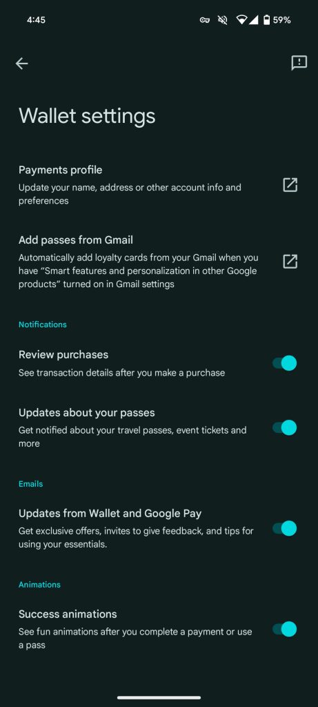“Success animations” is a new on/off toggle at the bottom of Google Wallet settings: “See fun animations after you complete a payment or use a pass.” Seasonal in nature, they appear above your card, but can now be disabled so that just the checkmark and “G Pay” logo appears.