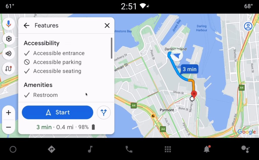 Similarly, wheelchair accessibility information will be surfaced in the Android Auto and Automotive apps to find step-free entrances, as well as locations that have accessible parking, seating, and restrooms. Look for a wheelchair icon next to the search results.