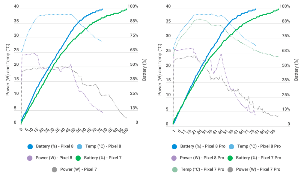 It was found back on the Pixel 6 series that Google’s charging method would hit its peak speeds during the first 50% of charging and then rapidly drop off as the battery filled up. Google later explained that this was to “strike a balance between battery life, longevity and fast charging” with an aim to “minimize degradation to preserve the lifespan of your battery.”