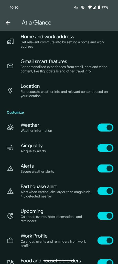 You’ll find 21 on/off toggles here, as well as a Manage Personalization list with settings shortcuts to Sensitive content on lock screen, Personalize using app data, Personalize using Google account data, Use your Google Activity, Assistant Personal Results, Home and work address, Gmail smart features, and Location.