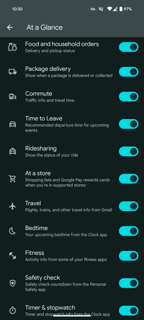 Meanwhile, At a store is a new At a Glance feature that will surface “Shopping lists and Google Pay rewards cards when you’re in supported stores.” This was previously teased with Android 12 and should now be live.