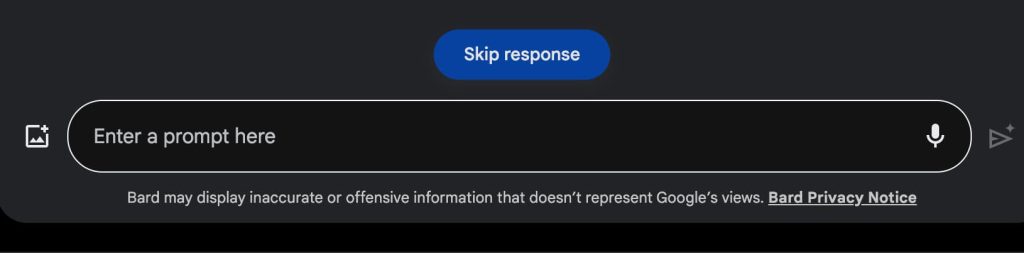 If you can tell the response won’t be useful, a blue “Skip response” button appears above the text field to stop Bard in its tracks and try something else. This appears to be the new default setting for Bard with a longer explanation offered.