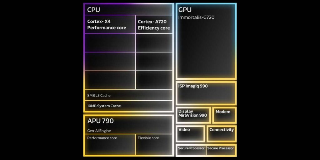 The most surprising aspect of MediaTek’s new SoC is how it compares to Qualcomm’s newest flagship chipset in build alone. The Snapdragon 8 Gen 3 holds a single Cortex X4, five A720 cores, and two Adreno A520 units. Qualcomm’s chip is set to be the most powerful SoC yet, but its architecture is undoubtedly very different from what MediaTek has gone for. Whether that bodes negatively for Qualcomm remains to be seen until both chips are running on various devices across the Android market.