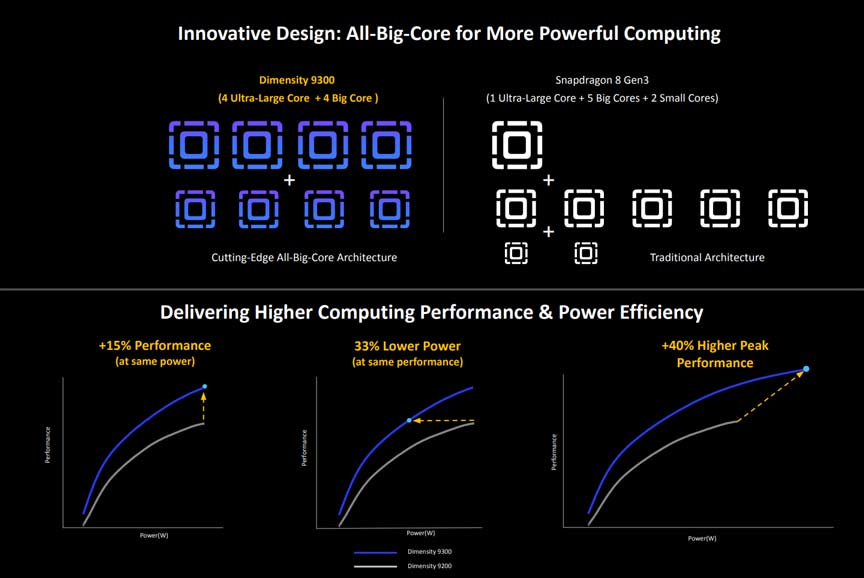 This approach allows MediaTek to focus on overall ability, with a 15% peak performance increase at the same power level – compared to the 9200. The Dimensity 9300 also delivers the same performance level as the 9200 at a 33% lower power rating. Across multiple cores, the 9300 comes in at a 40% higher peak performance.