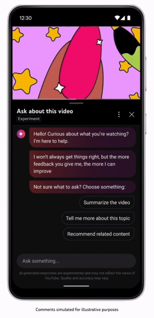 In addition to generative AI for Creators, YouTube is now testing a conversational AI for end users that lets them ask questions about videos and navigate comments more easily.