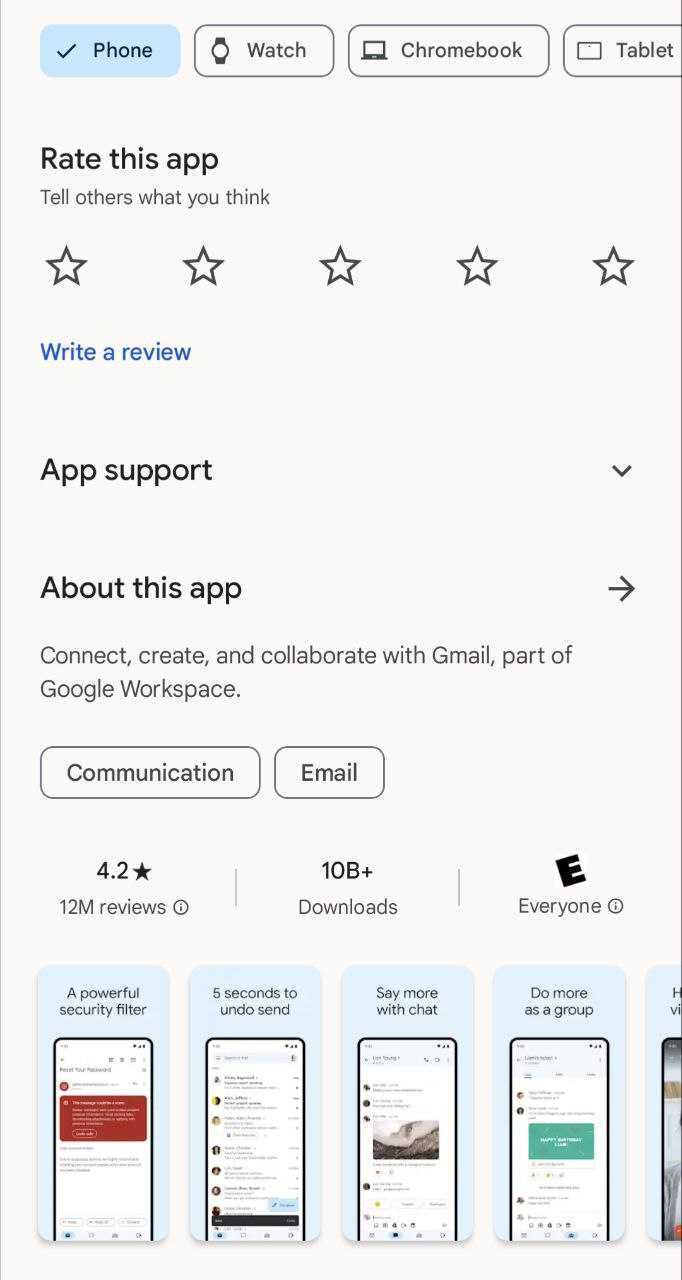 The Play Store is now adding a form factor carousel — Phone, Watch, Chromebook, Tablet, Car — that updates the screenshot gallery below.