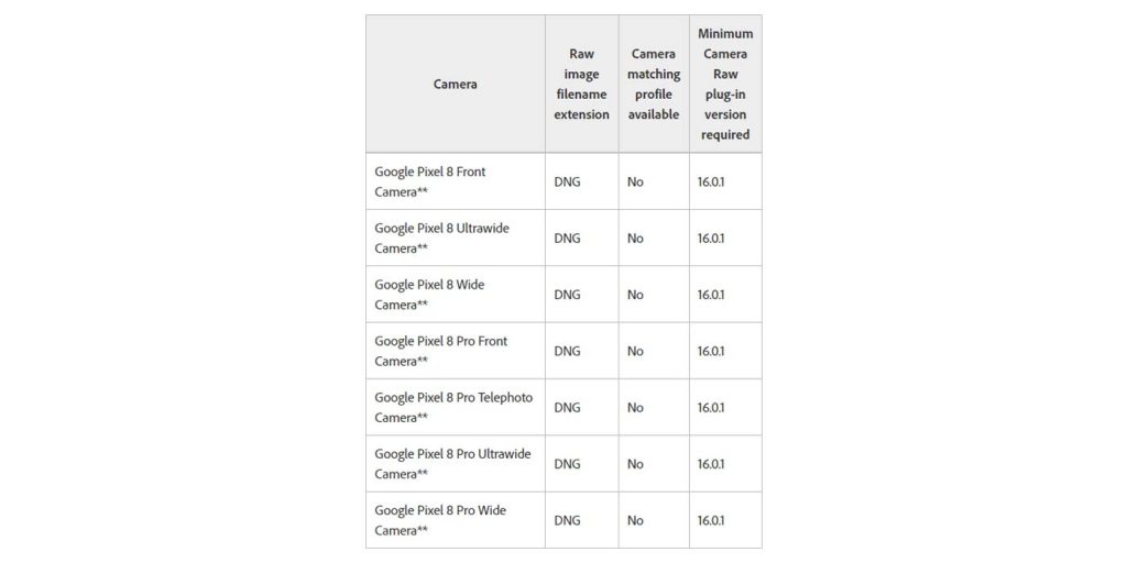 Adding RAW compatibility for the Pixel 8 series means that Lightroom and Photoshop will recognize RAW files from that device, which comes in as a DNG file on the Pixel 8 and 8 Pro. That support is added for the front-facing camera, wide-angle lens, and main sensor on the Pixel 8.