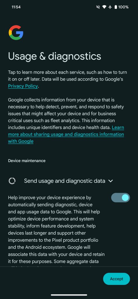 ‘Your Pixel is up to date’ + Usage & diagnostics screen after installing