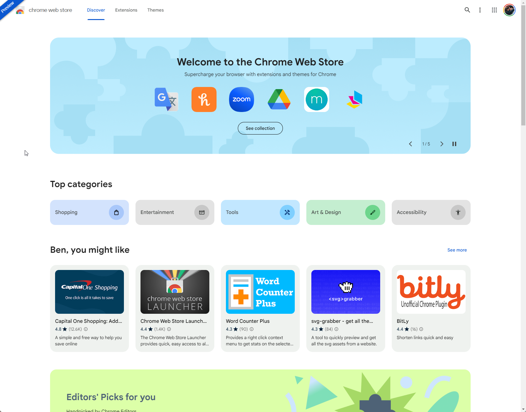 We’re excited to give you a preview of our redesigned Chrome Web Store to make searching for fresh themes and extensions easier. The changes include a modernized interface, personalized extensions, and curated recommendations.