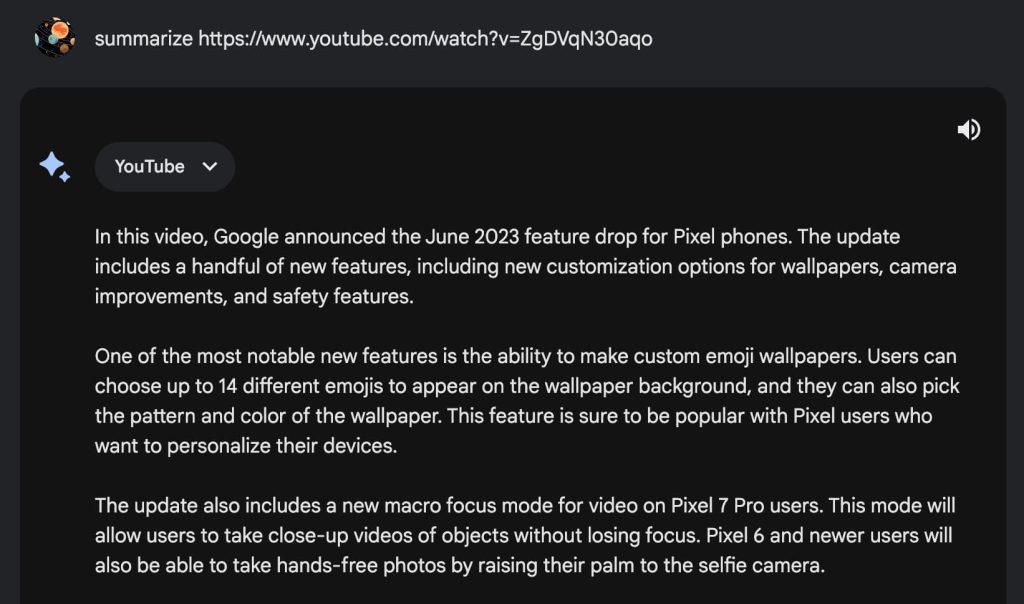 The underlying functionality, like “summarize” followed by a YouTube link, appears the same in our brief testing. You can then ask Bard some follow-up questions. Notably, Bard’s new YouTube capabilities are available for all users instead of still being in testing.