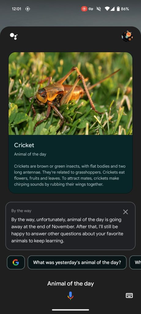 The last animal/insect of the day is the cricket. In recent weeks, Google telegraphed this removal to those who triggered the command, but you will still be able to ask Assistant questions about animals (“Where does a fox live?”).