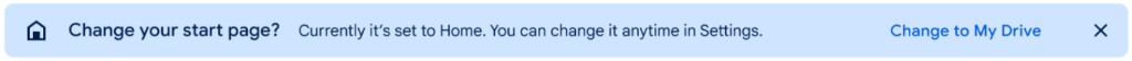 The goal is to “help you get started quickly.” Notably, going to drive.google.com will open this new Home view by default as your “start page,” but you can set “My Drive” to be your homepage again. A banner explains this when Home is available for your account, while you can change it whenever from Settings.