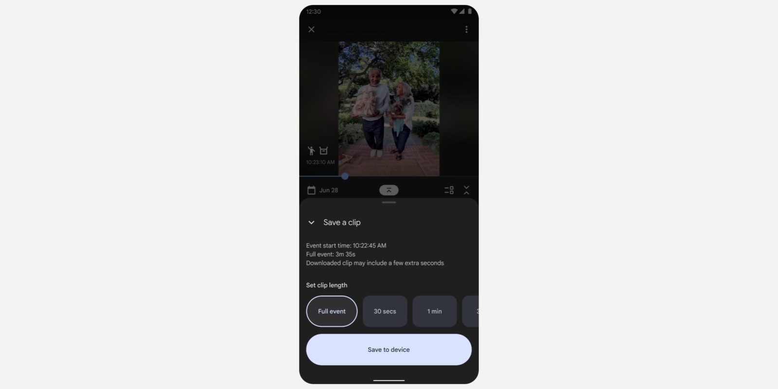You can “trim an existing event video clip by simply picking a start time and selecting the clip length from a set of options,” like Full event, 30 secs, and 1 min.