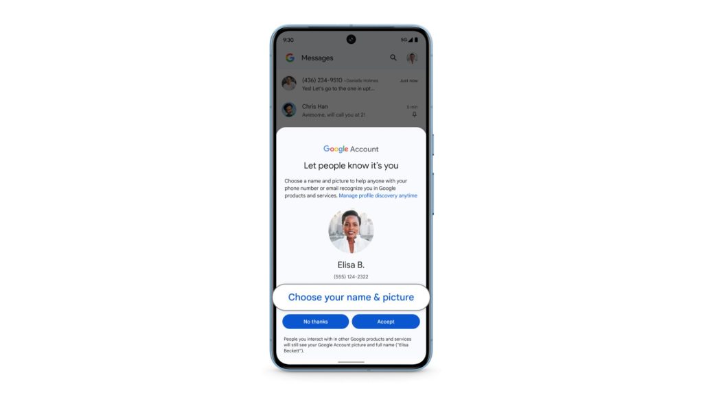 Finally, Google is officially launching Profiles that have already appeared for some. This lets you set a profile name and picture that connects to your phone number. This will “shape how you appear across Google services.”