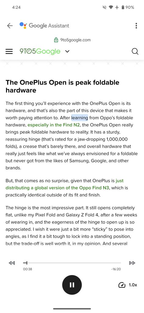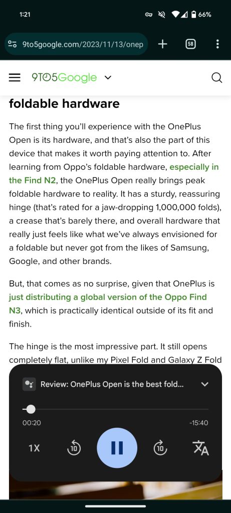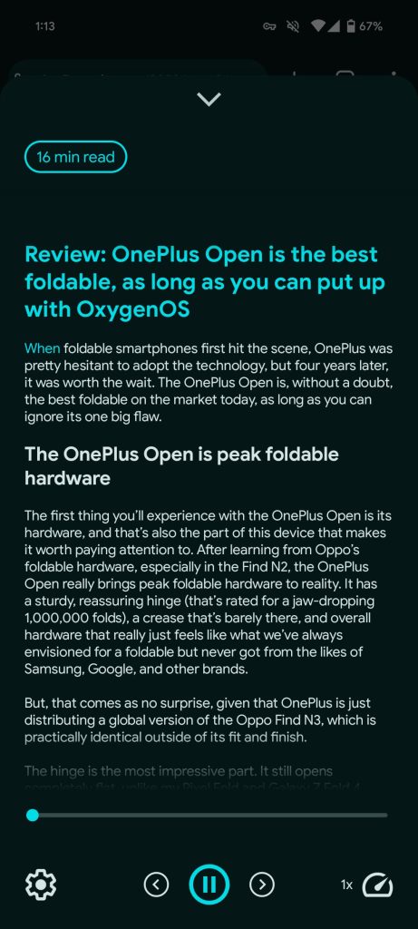 In terms of TTS quality, I find that I’m not particularly picky between Reading mode, which uses the Android default, and the new offering. That said, Google should really update the new Read aloud experience on Pixel before bringing it to future devices. The UI does look quite modern and minimal, but the implementation is just lacking and is a regression despite the AI it introduces.