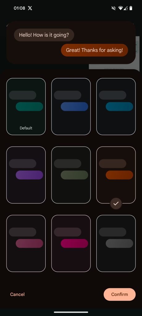 Meanwhile, here’s a look at the upcoming Custom Bubbles feature that we enabled. From a conversation’s overflow menu, you’ll find a new “Change colors” option. Including the default, there are nine themes in total, with the picker providing a preview. The color you or the recipient selects will remain synced. It is not yet widely rolled out for beta users.
