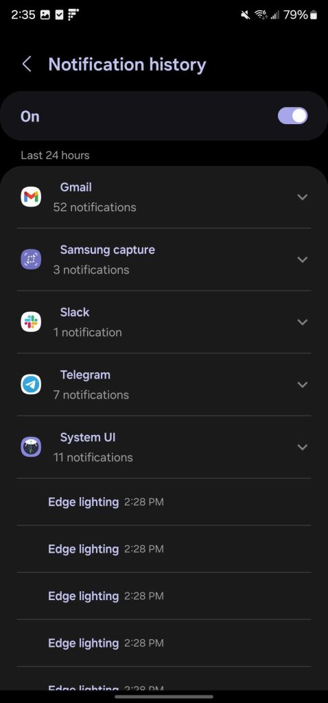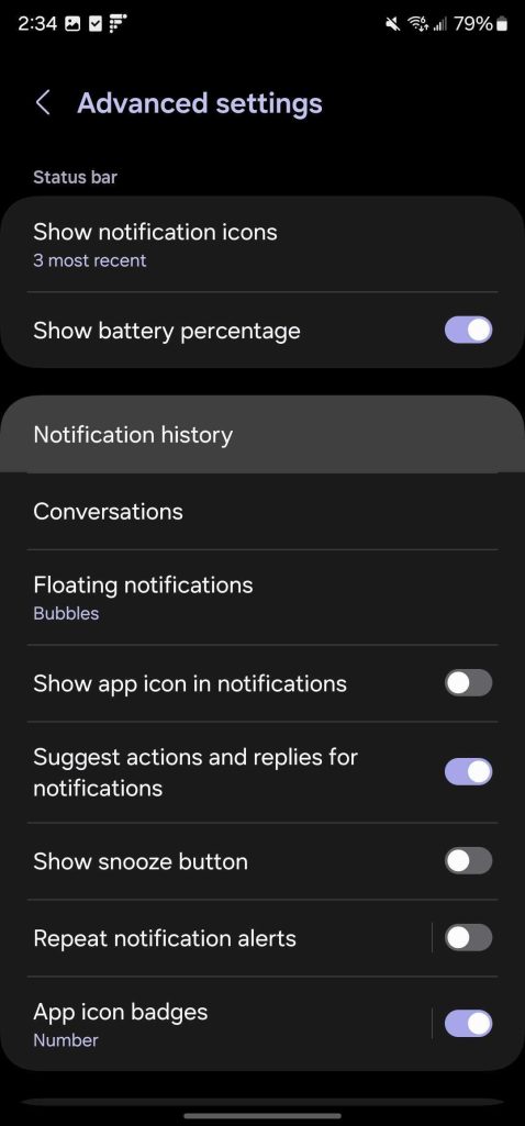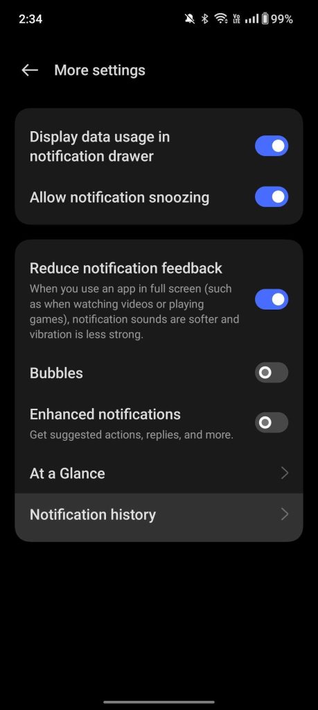 On One UI 6, Samsung’s take on Android 14, the situation is pretty much identical. You’ll find notification history under Settings > Notifications > Advanced settings > Notification history. I’m not sure what about a useful feature like notification history can be considered “advanced,” but that’s where we are.
