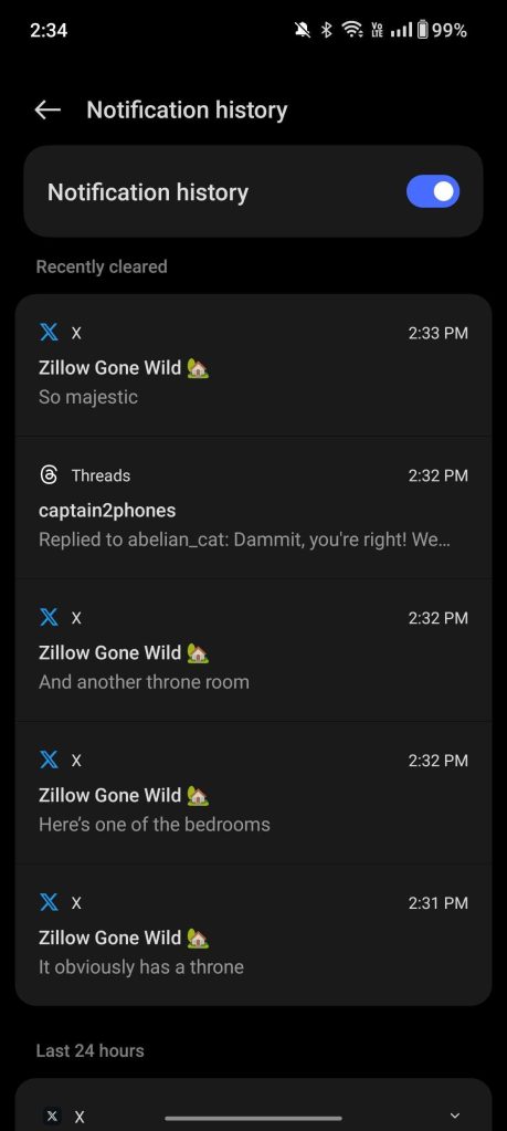 I’m not sure what would change the minds of Samsung and OnePlus here, besides iOS adopting something similar. As it stands today, iOS doesn’t offer notification history, as least not in the same capacity. Apple says you can view old notifications by swiping up in Notification Center, but that doesn’t apply if you’ve cleared notifications out, but we’ll leave a deeper discussion about iOS notifications for another newsletter.