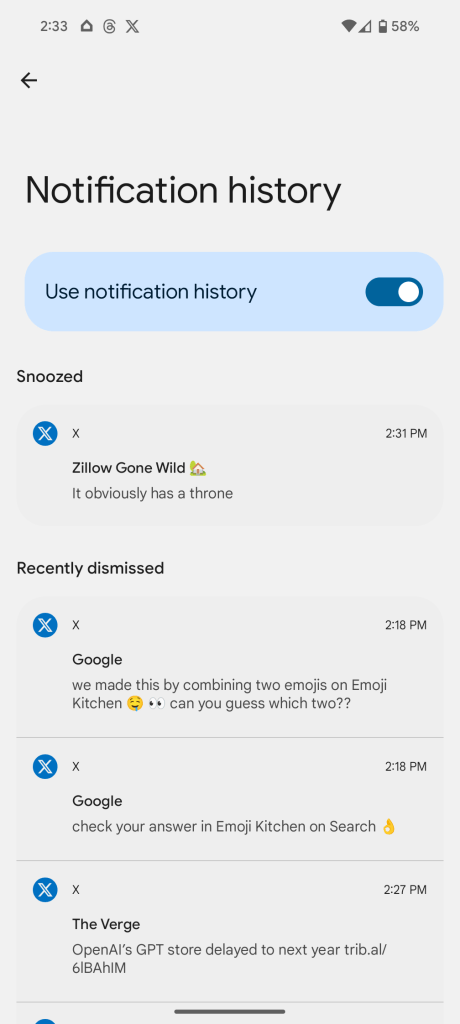 I’m not sure what would change the minds of Samsung and OnePlus here, besides iOS adopting something similar. As it stands today, iOS doesn’t offer notification history, as least not in the same capacity. Apple says you can view old notifications by swiping up in Notification Center, but that doesn’t apply if you’ve cleared notifications out, but we’ll leave a deeper discussion about iOS notifications for another newsletter.