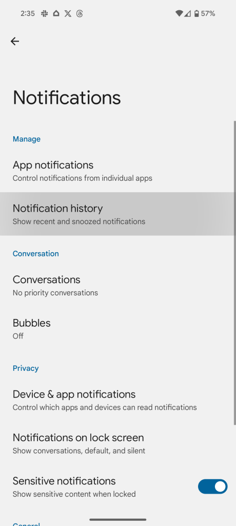 On One UI 6, Samsung’s take on Android 14, the situation is pretty much identical. You’ll find notification history under Settings > Notifications > Advanced settings > Notification history. I’m not sure what about a useful feature like notification history can be considered “advanced,” but that’s where we are.