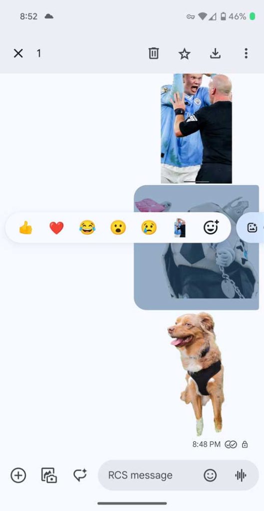Besides being an odd portmanteau, Photomoji can show up in two places on a message thread in the Google Messages app. First, you’ll be able to use these pictures-turned-emojis as stickers. They’ll appear as images when sent to other RCS/SMS users on any device receiving them.