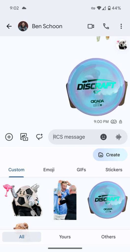 If you look too fast, you might miss the new Photomoji create feature in Google Messages altogether. In the built-in reaction menu within the compose field, a new category called “Custom” will appear. From there, you’ll be able to use and create your arsenal of Photomoji.