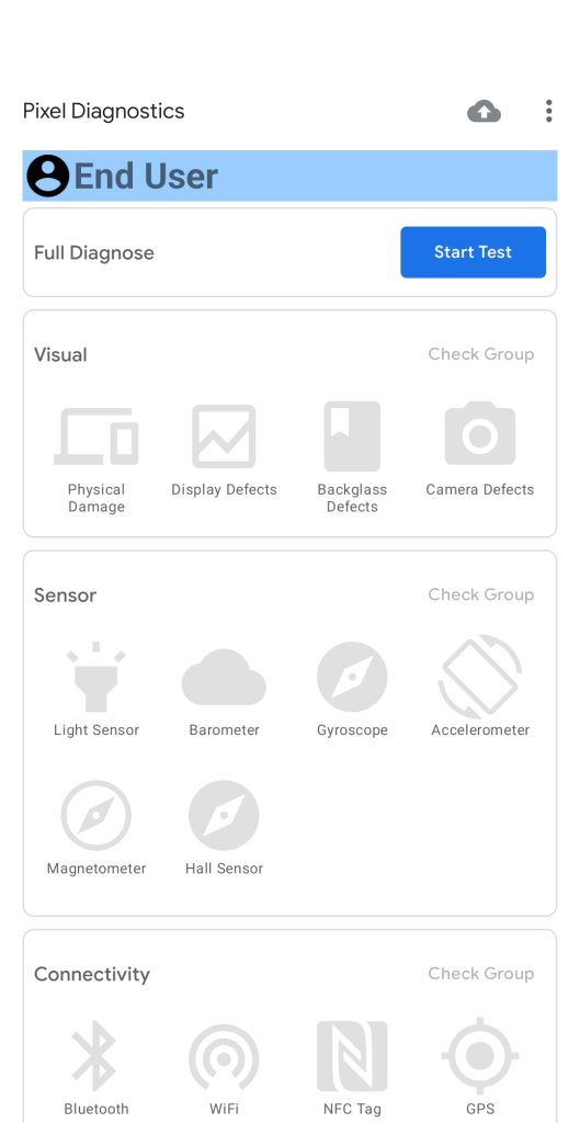 Tests are grouped by Visual, Sensor, Connectivity, Camera, Audio, Screen, Others, Outer Display (on the Pixel Fold), and Defects. There’s a “Full Diagnose” option to “Start Test” at the top. This tool might have existed before internally, but Google is only now publicizing it.