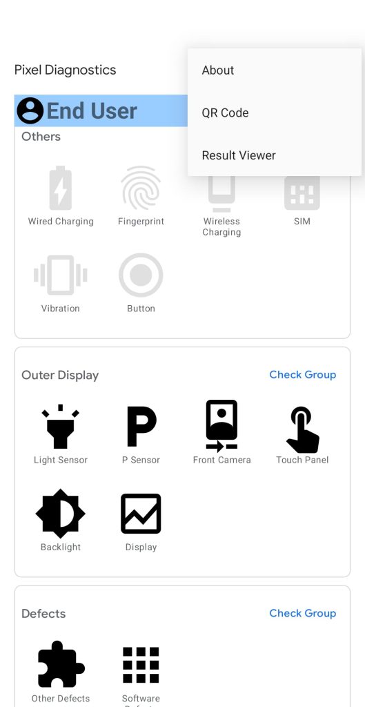 The Pixel Diagnostic App is launched by entering a code — *#*#7287#*#* — into the Phone dialer. It lets you perform diagnostics on your Pixel “before and after a repair.” Availability is listed as such: