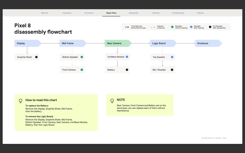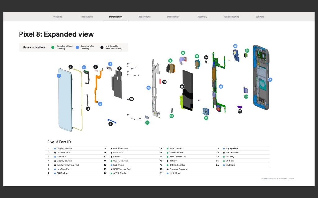 Hundreds of pages in length, you get step-by-step instructions to “assemble or disassemble your Pixel device,” as well as “Remove and replace parts.” Complete with pictures, the Pixel 8 document is 200+ pages, while the Pixel Fold comes in at over 400. Google will “continue to upload repair manuals for previous and future devices in the coming months.”