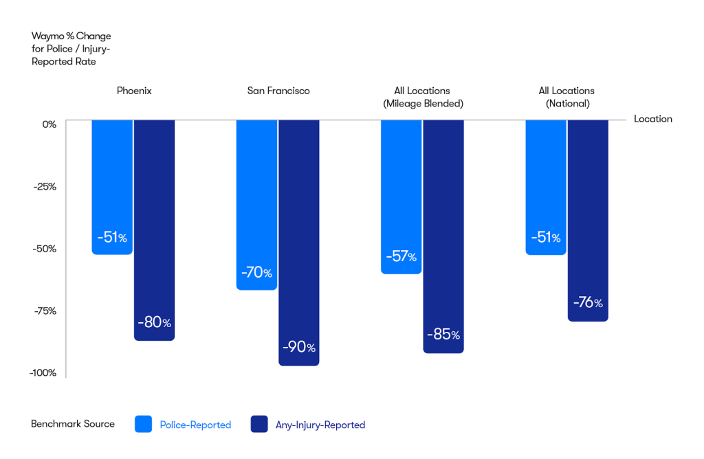 New safety research from Waymo finds that its driverless cars “led to a significant reduction in the rates of police-reported and injury-causing crashes compared to human drivers.”