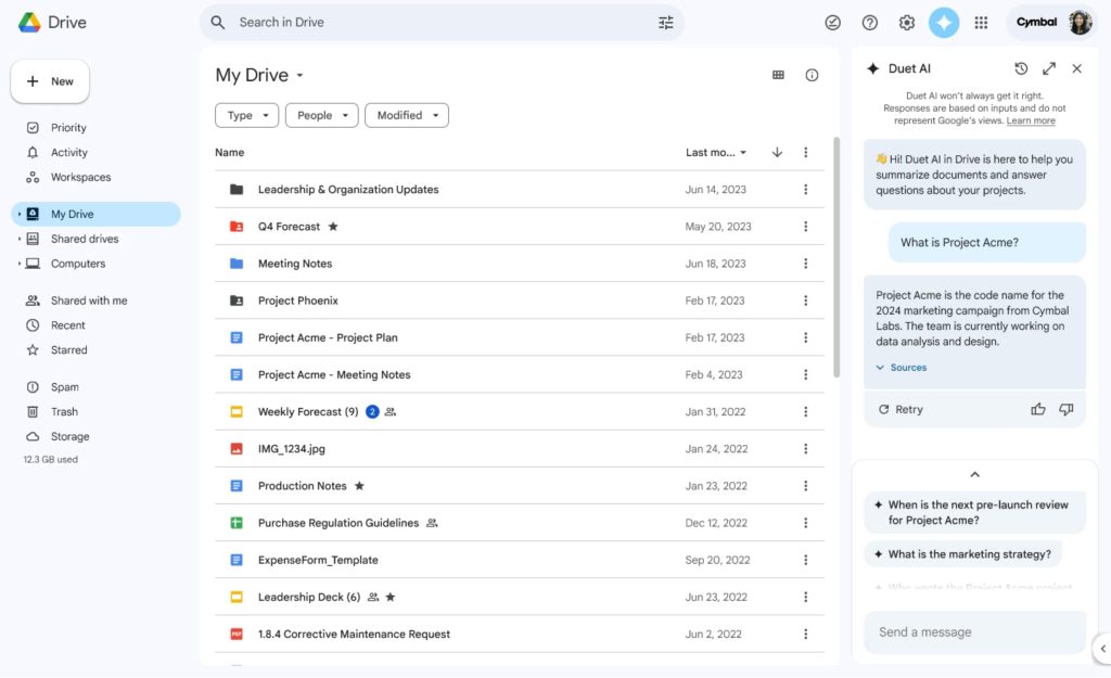 In Google Drive, you’re able to right-click on a document and ask Duet AI questions about the file, including: