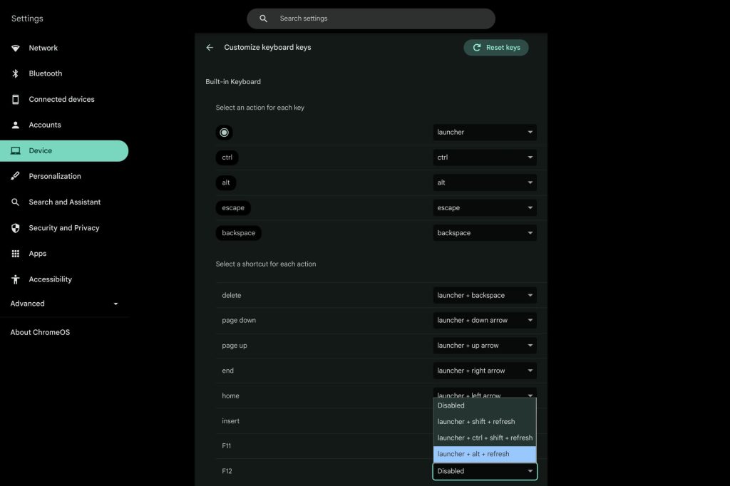 Lastly, a new “Customize keyboard keys” page (under Keyboard) lets you “Select a shortcut for each action” delete, page down/up, end, home, and insert, as well as the ability to enable/use F11 and F12 via predefined key combos.