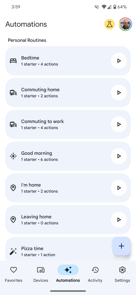 In the Google Home app, the Automations tab offers a master list of all of your custom-built Google Assistant routines. For instance, I have a routine called “Pizza Time” that sets a 15-minute timer, while far more complex routines can be created with scripting.