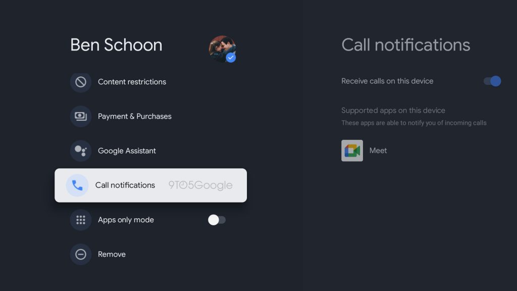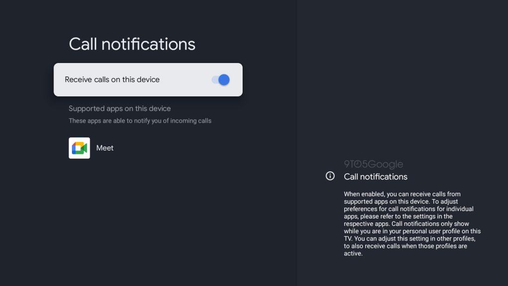 When opening Google Meet, a notification appears saying that call notifications have been enabled. In the Settings, Meet shows up as one app that can use the new permission, but it’s presumably not the only one. We’d guess that Zoom for Android TV OS, currently exclusive to Sony Bravia, would also work with this.