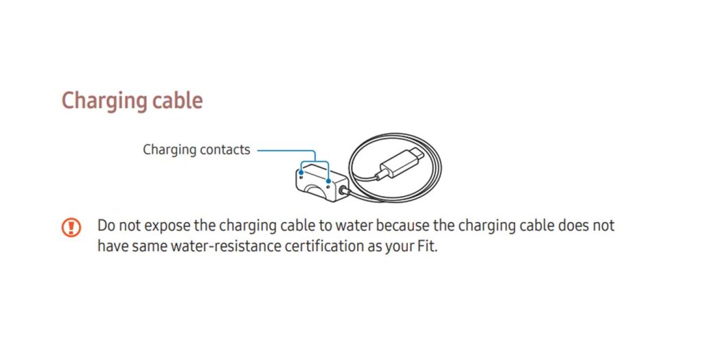 We also get a quick look at the charging cable, which will utilize two connection pins that attach to the back of the Galaxy Fit 3 and won’t simply be a wireless charging connection. It does terminate in a USB-C connector.