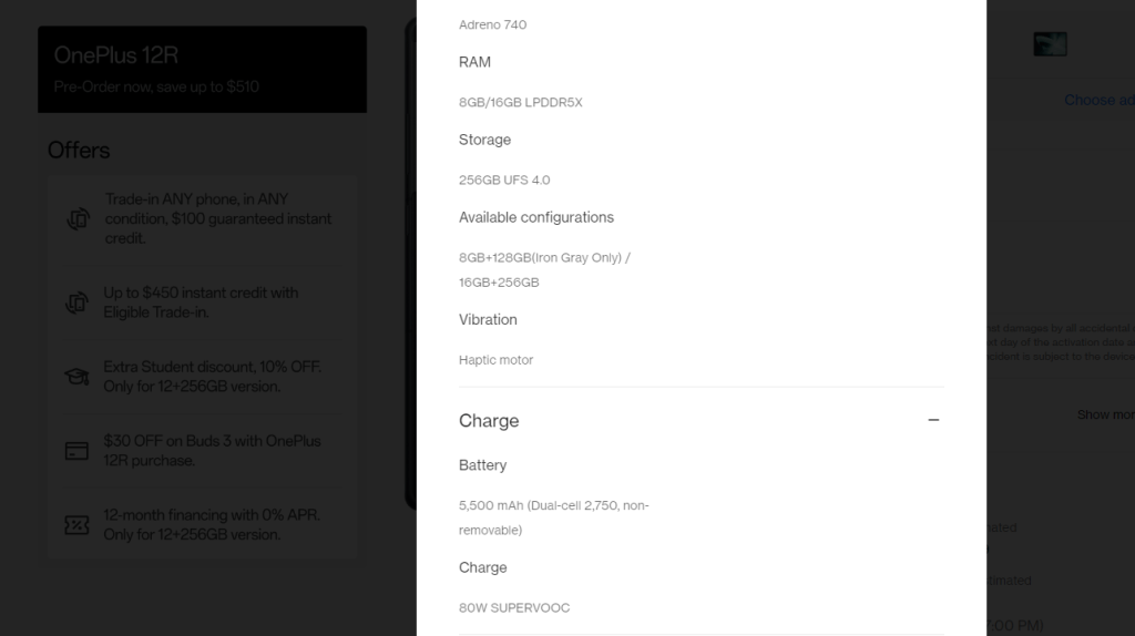 Through its announcement and the start of pre-orders for the OnePlus 12R, the brand’s website listed the device with UFS 4.0 storage. That newer storage standard is faster than its predecessor, UFS 3.1, which can result in a snappier device. But that’s not the case after all.