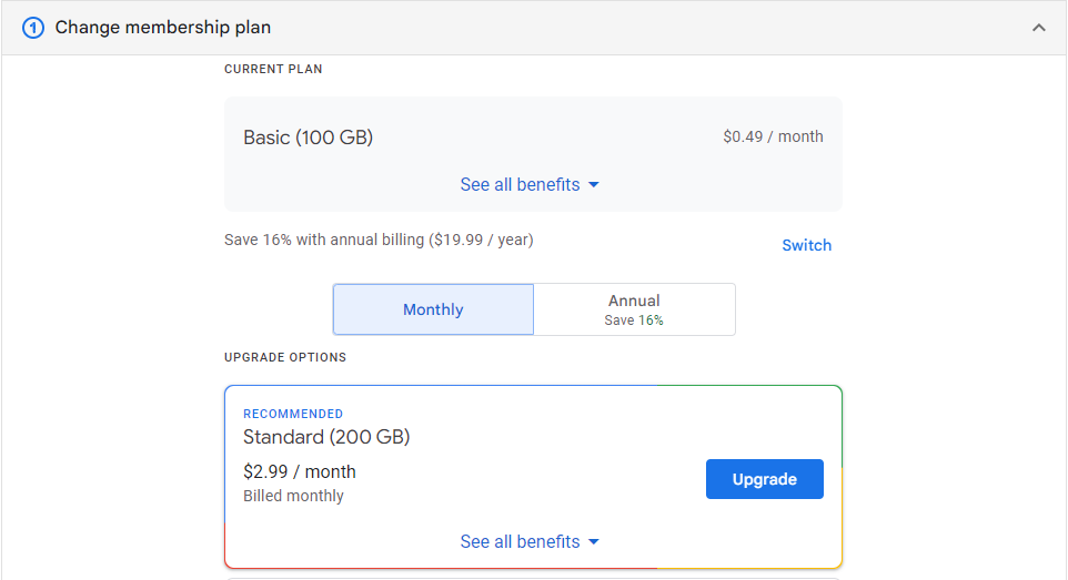 We’ve tested this on an account that had no Google One plan. By subscribing to the 100GB plan, we were able to access the “change membership plan” section of One’s settings and, there, the 200GB plan is immediately “recommended” by Google, despite being hidden during setup.