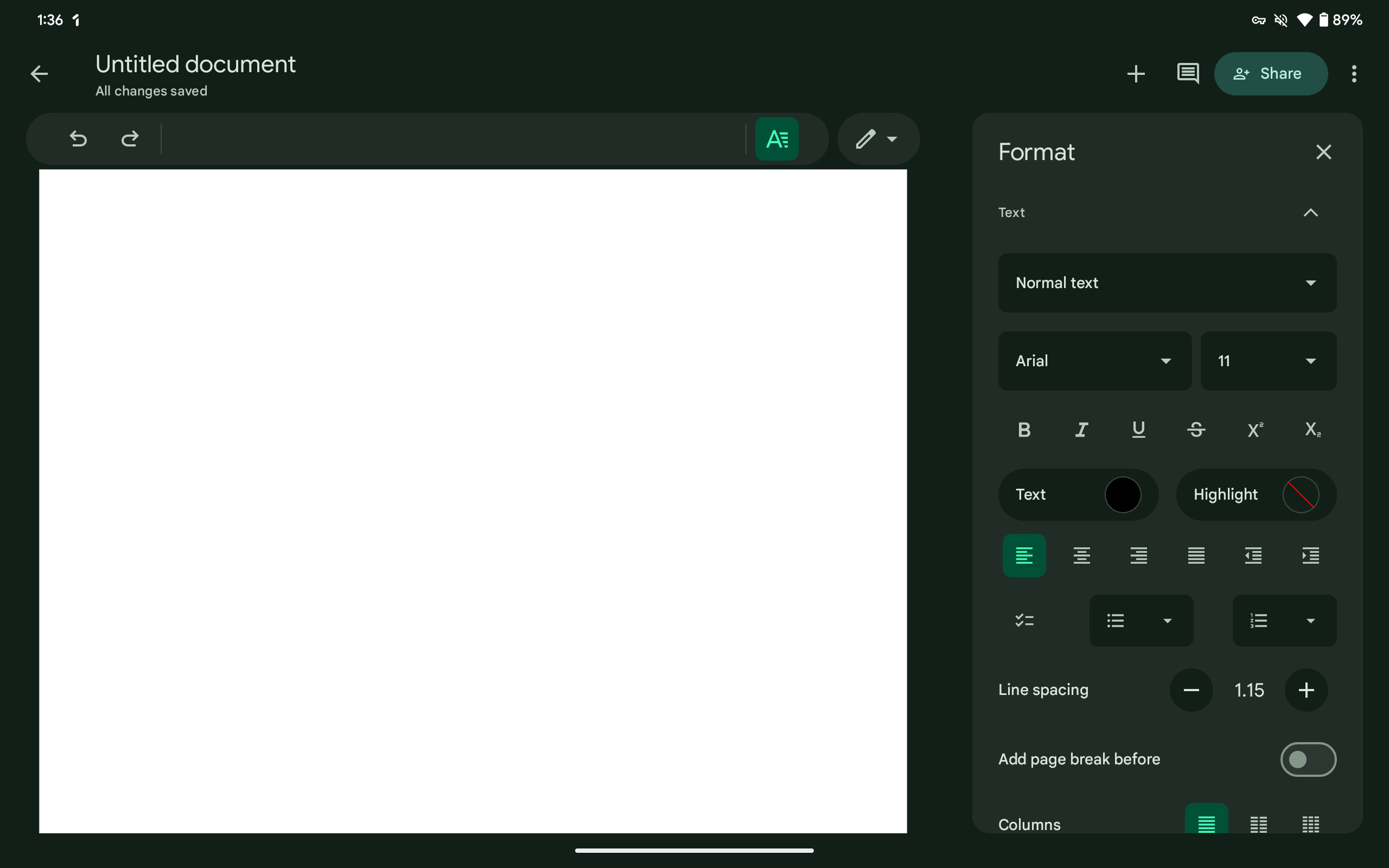 The sidebar offers much better spacing than the toolbar and is also persistent as you enter text. You get access to line spacing, columns, clear formatting, and other granular options this way.
