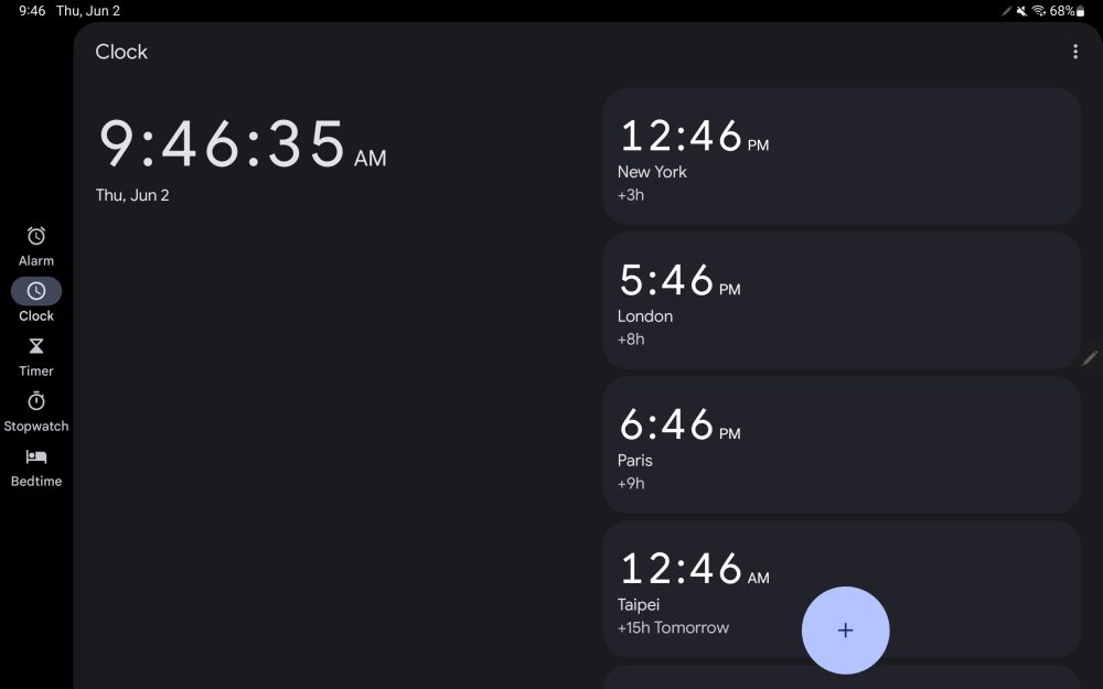 Update 6/3: Google Clock 7.2 starts by introducing a left-sided navigation rail on tablets that gives the app more vertical space as a result. The other big change is the use of two-column layouts, when in landscape orientation, throughout the application.